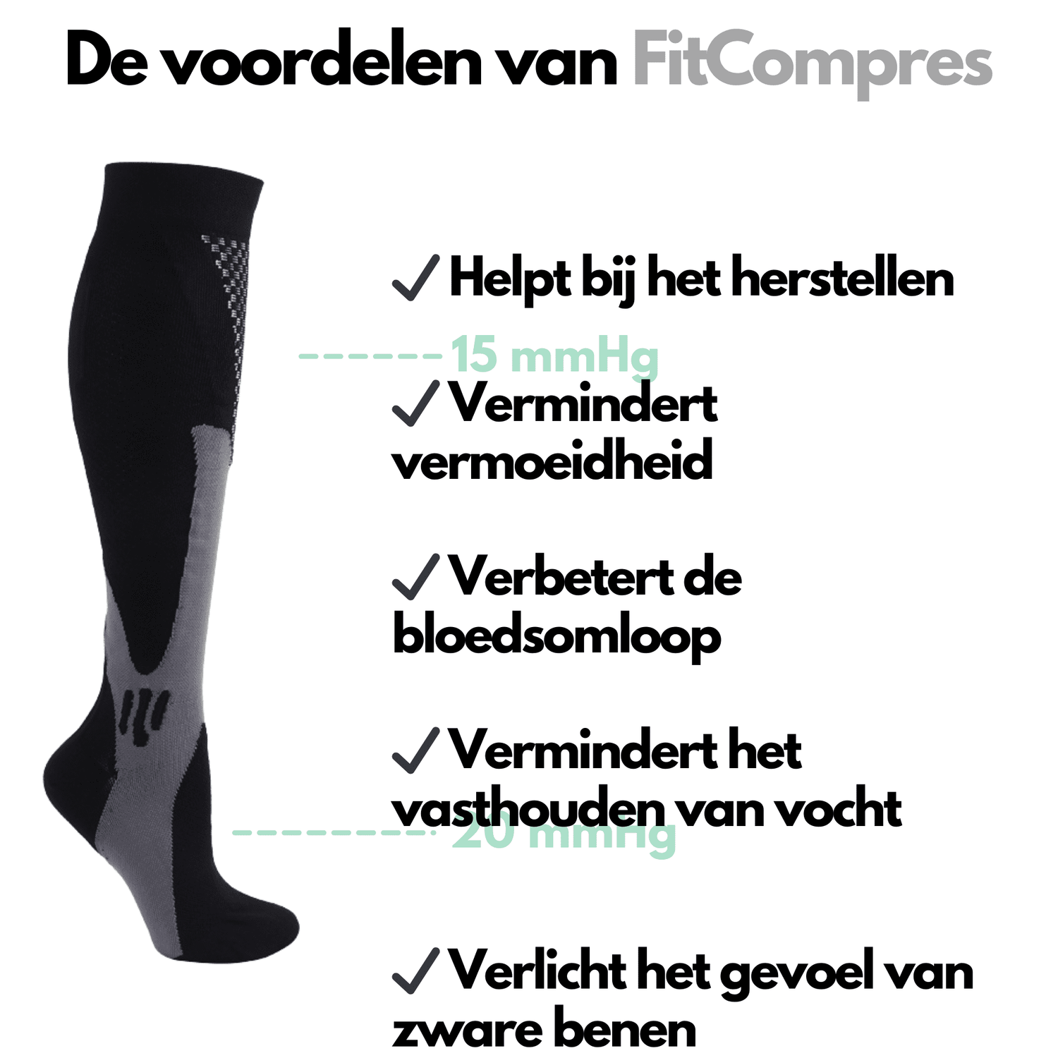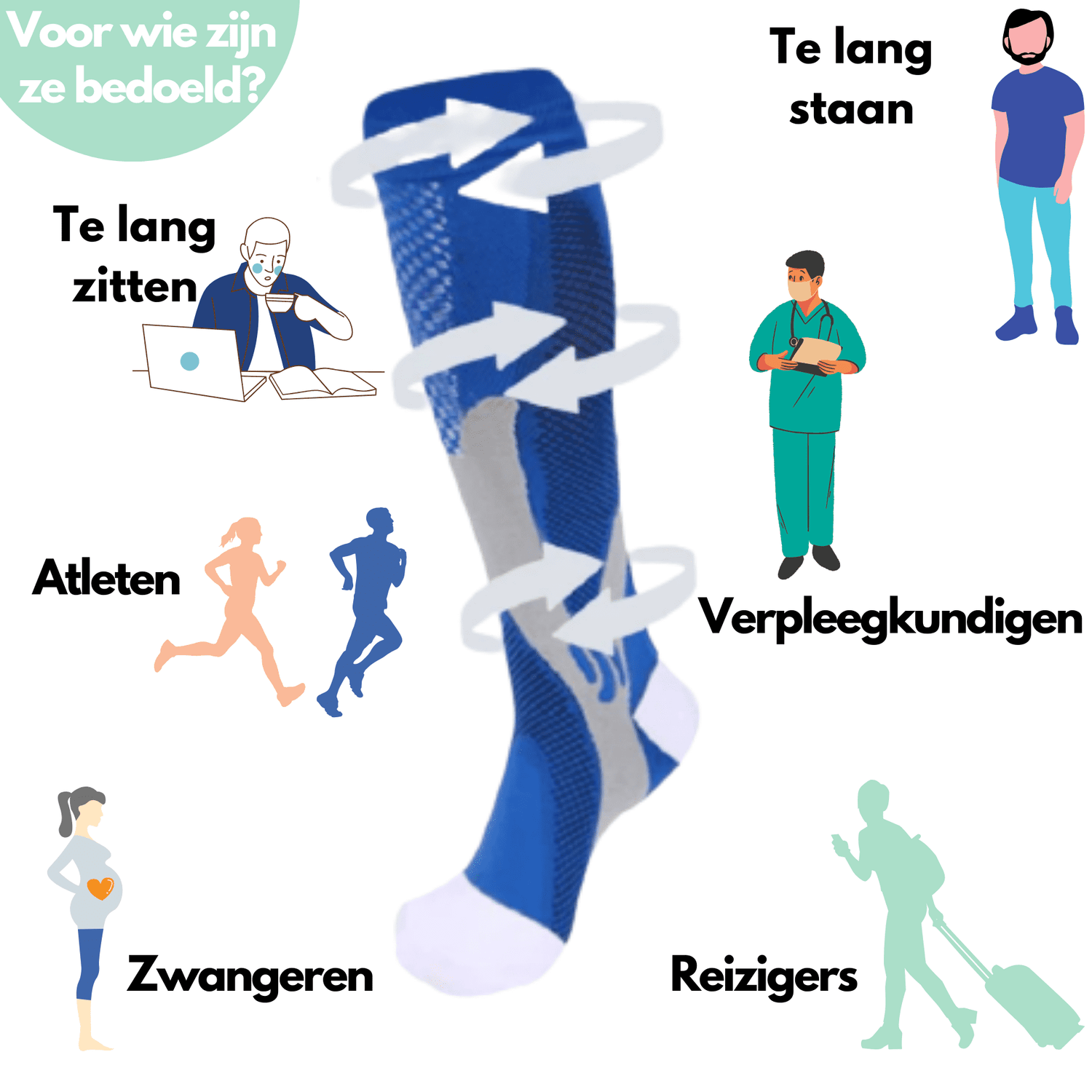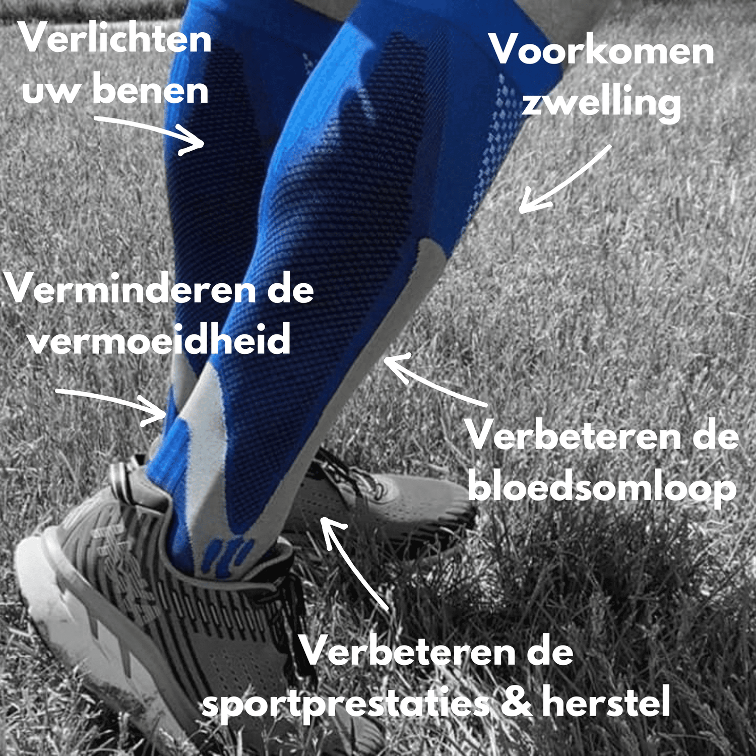 De compressie stimuleert de bloedsomloop, wat het gevoel van zware benen voorkomt, de prestaties verhoogt, en herstel na het sporten bevordert.